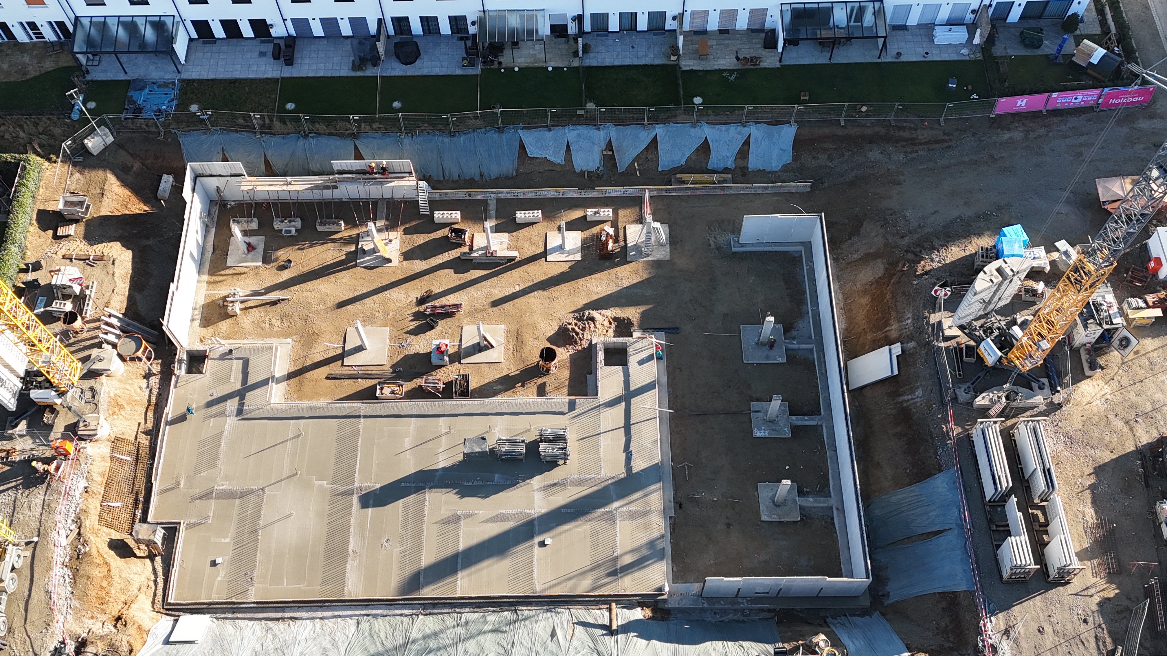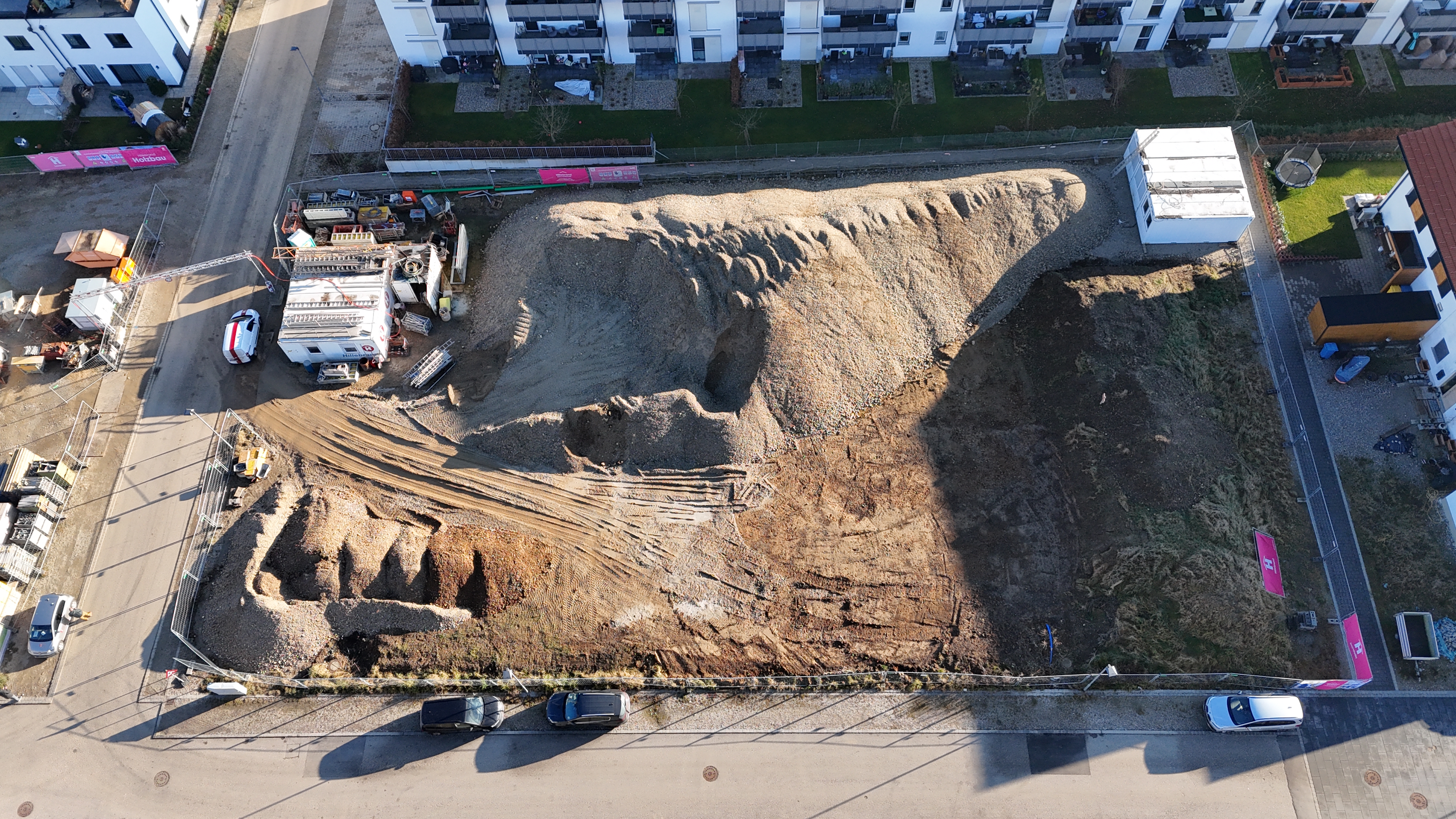 Alle vier Wohngebäude sind unterkellert. Diese entstehen auf zwei Bauplätzen. Ursprünglich sollten alle zwei Bauplätze mit einer Tiefgarage ausgeführt werden. Aufgrund der nachhaltigen Bauweise und der Betrachtung der Lebenszykluskosten konnte jedoch auf eine Tiefgarage verzichtet werden. Somit wird noch ein Bauplatz mit einer Tiefgarage ausgeführt und die restlichen Stellplätze können oberirdisch geschaffen werden. Der vorgeschrieben Stellplatzschlüssel der Stadt Burghausen kann trotzdem eingehalten werden.